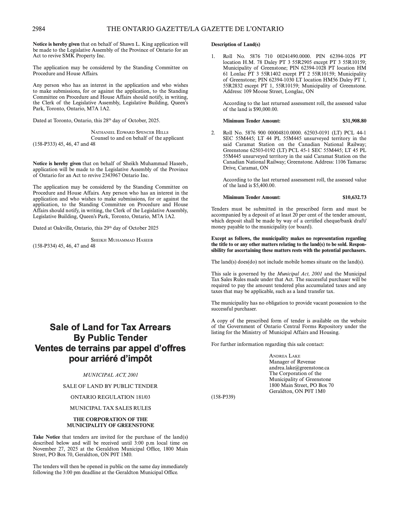 New Listings:Week of November 17thProperty listings sourced from The Ontario Gazette at: www.ontario.ca/government/ontario-gazette