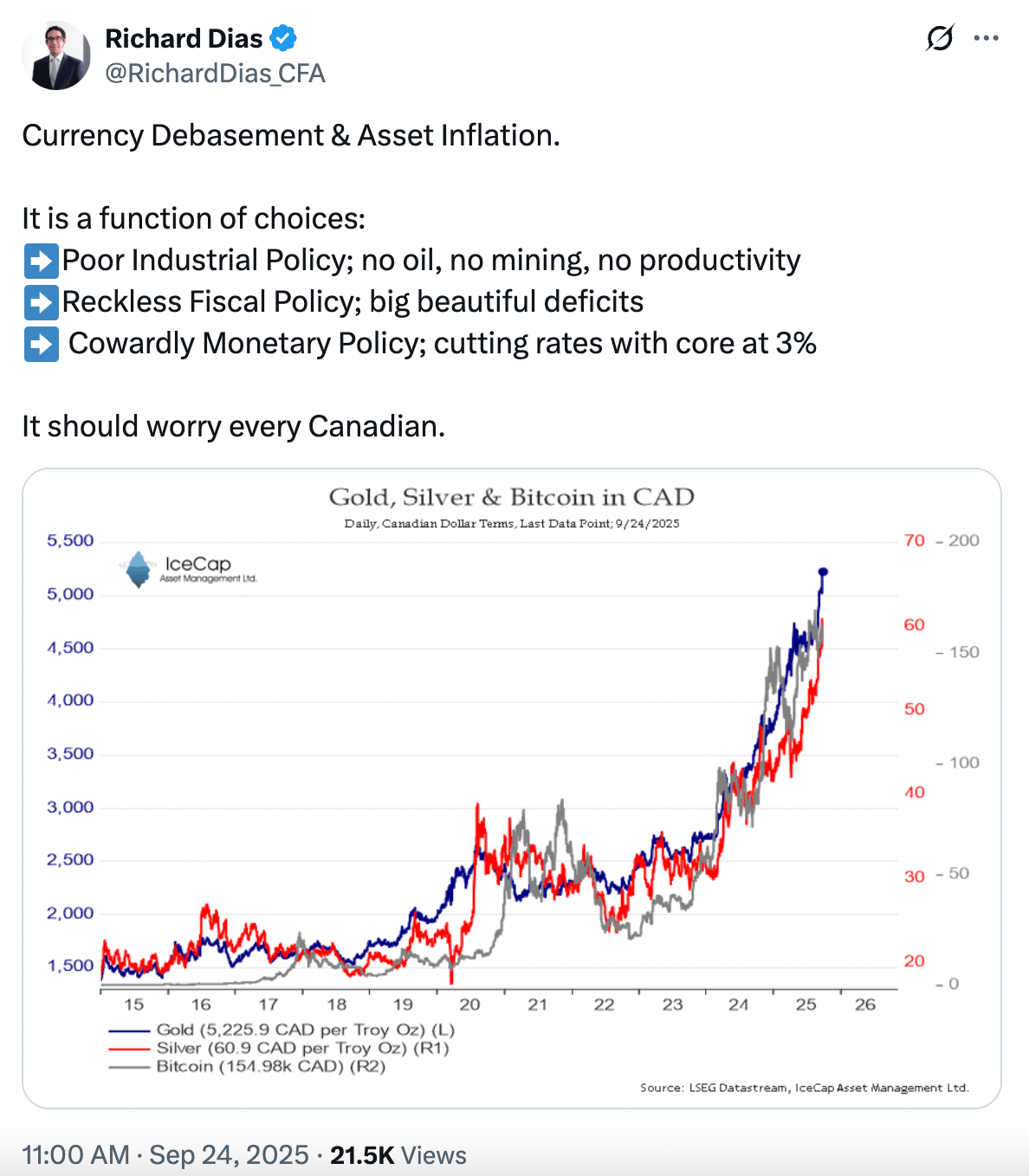 Richard Dias, IceCap economic analyst, charted out gold, silver, and Bitcoin in Canadian dollars and it's becoming quite obvious that all of the money printing is driving up the fiat dollar prices of good hard assets.